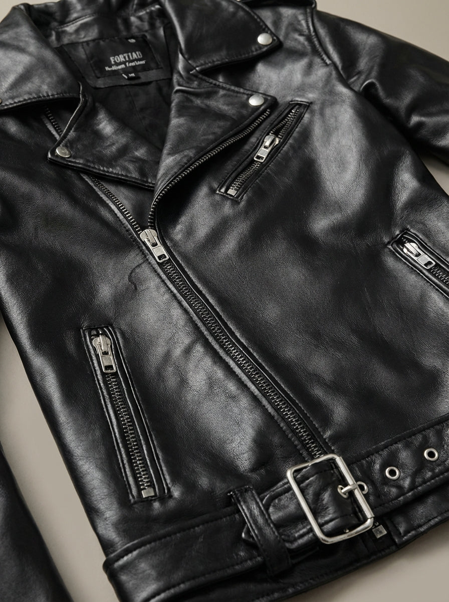 This men's biker jacket features a collared neckline, long sleeves, and a zip front for a bold everyday look. The belt detail and structured silhouette create a defined appearance that pairs well with different outfit combinations. Suitable for daily wear, casual outings, or evening plans.