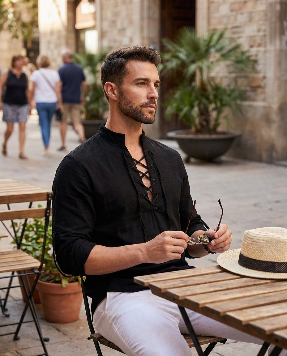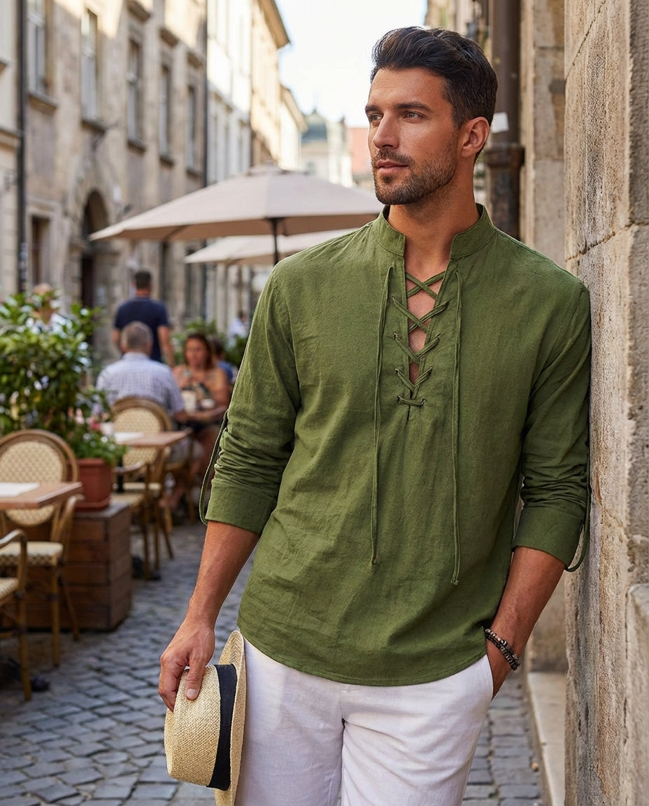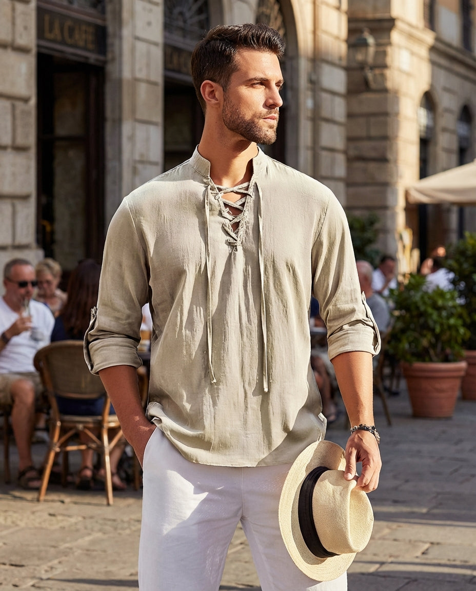 This men's casual shirt features a stand-up collar, long sleeves, and a drawstring detail for a clean and modern everyday look. The structured silhouette creates a balanced shape that pairs easily with different outfit combinations. Suitable for daily wear, casual outings, or a more styled off-duty appearance.