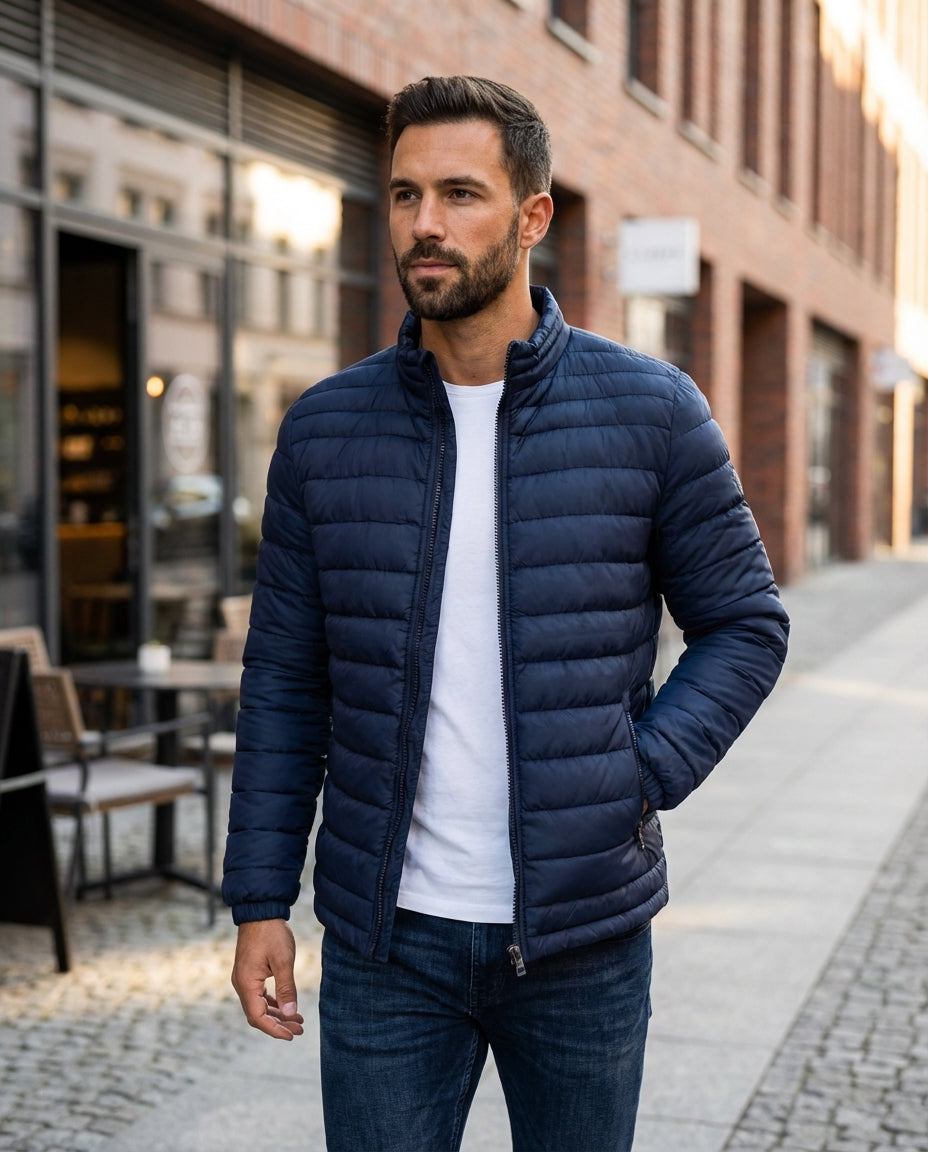 This men's jacket features a stand-up collar and a zip front with a quilted surface that adds depth to the overall design. The structured silhouette creates a strong everyday look that pairs easily with different outfit combinations. Suitable for daily wear, city outings, or cooler weather styling.