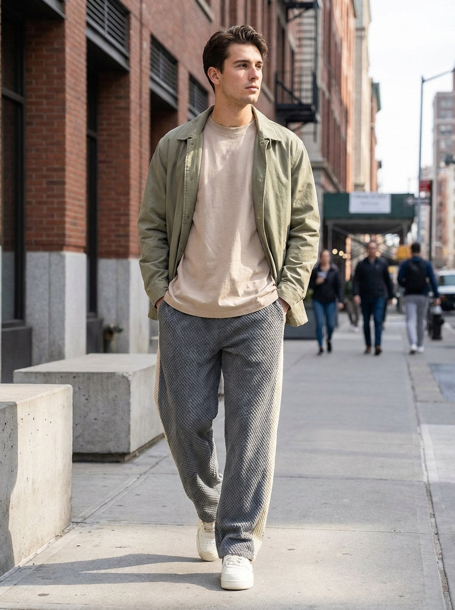 This men's trouser features a straight leg silhouette with a textured finish and a drawstring detail for a clean everyday look. The balanced shape creates an easy outline that pairs well with different outfit combinations. Suitable for daily wear, casual outings, or off-duty styling.